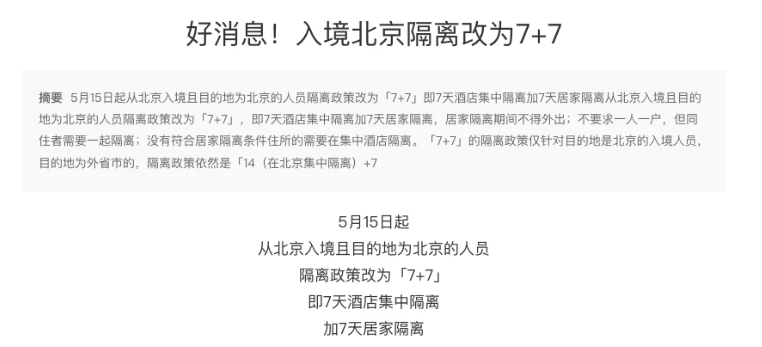 据早前上海台协官网发布的信息显示,从5月15日起,入境地点、最终目的地都为北京的人,隔离政策为“7+7”,即7天酒店集中隔离+7天居家隔离。居家隔离期间不得外出,不要求一人一户,但同住者需要一起隔离。