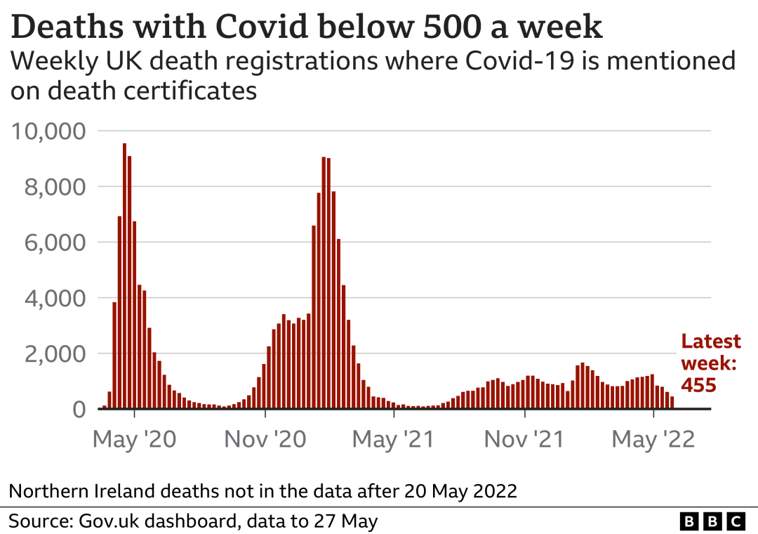 根据国家统计局的数据,在截至5月27日的一周内,英格兰、威尔士和苏格兰有455例新增新冠相关死亡报告,保持下降。