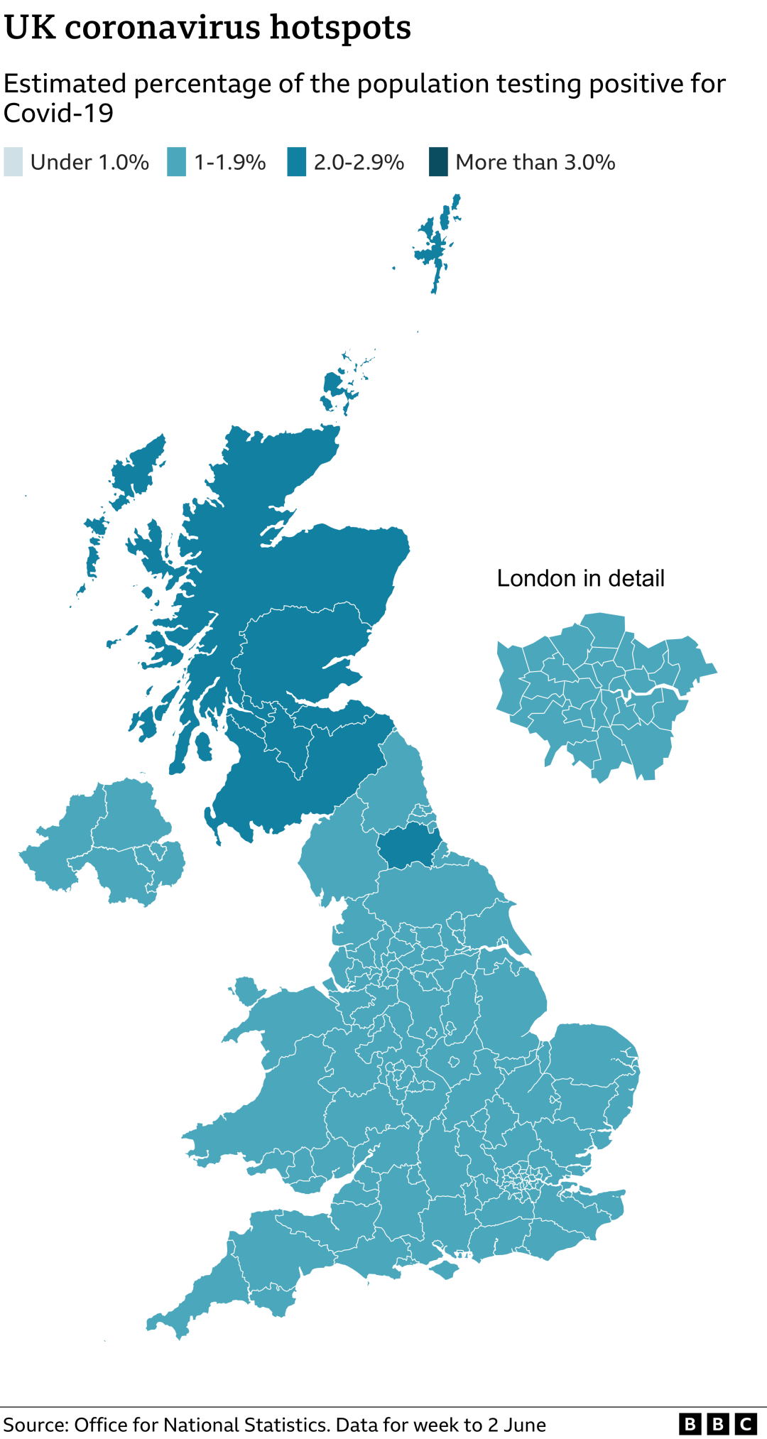 截止6月2日,全英各地感染热点地区 | 图片来源BBC