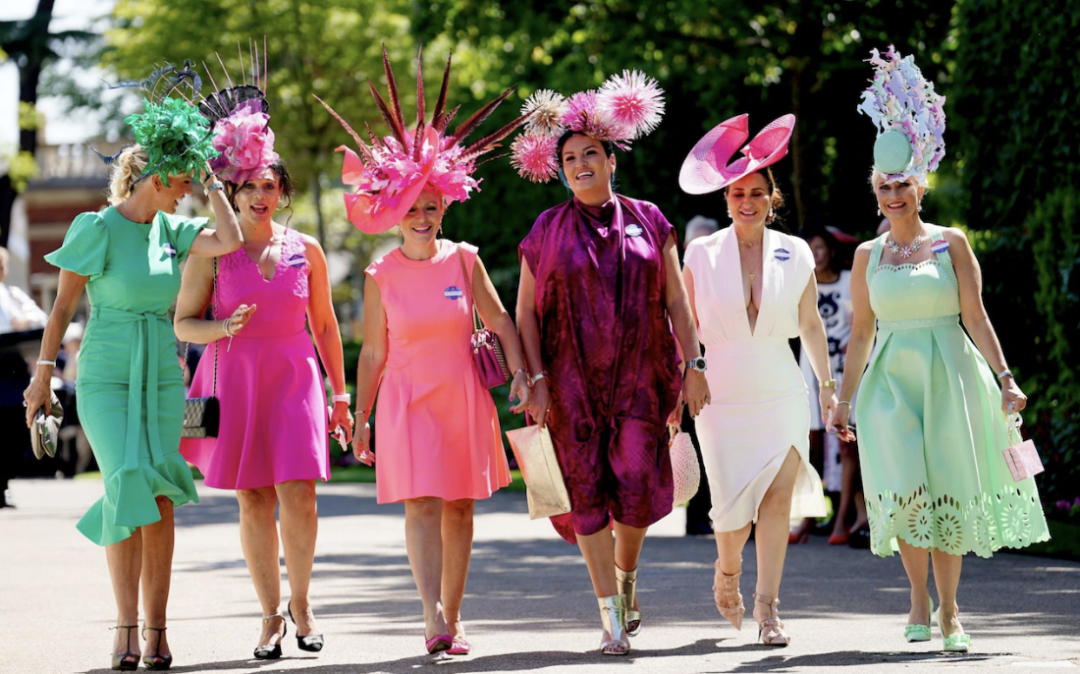 皇家赛马会另外的一个主题就是时尚,参会有一个严格的着装规定——女性参与者在任何时候都要戴上头巾、头饰或帽子。因此会场当场人们佩戴的各式各样的帽子更是这周的亮点,因此也被英媒称为“帽子的盛会”。