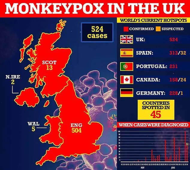 英国卫生安全局(UKHSA)截止6月16日(周四)的数据显示,英国新增52例猴痘感染确诊病例,使得英国确诊总数达到524例。其中,英格兰504例,苏格兰13例,威尔士5例,北爱尔兰2例。