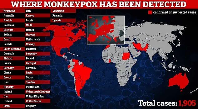 包括美国、西班牙和葡萄牙在内的世界上几十个国家都已报告出现确诊病例,全球猴痘病例至少已超过1,900例。