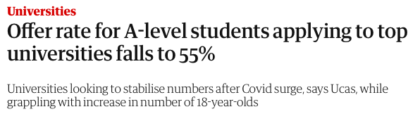 包括罗素集团大学(The Russell Group)在内的英国顶尖大学已经收紧了录取通知的发放,录取申请比例从2021年的60.5%下降至今年夏天的55.1%。