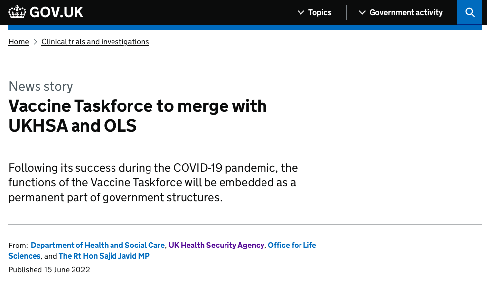 在新冠疫情期间试验成功后,疫苗工作组(VTF)现正与英国卫生安全局(UKHSA)和生命科学办公室(OLS)合作,成为政府基础设施中的一个永久性机构。旨在保留新冠疫情应对期间所获得的经验教训、创新和技能组合。