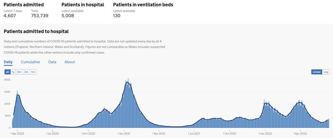 从2021年3月5日以来,苏格兰地区共有累积新冠入院患者65,243名(*)确诊患者出院。截至6月5日午夜,近期住院的疑似/确诊新冠患者637名(+47),其中8名(+4)确诊新冠在重症监护室ICU。