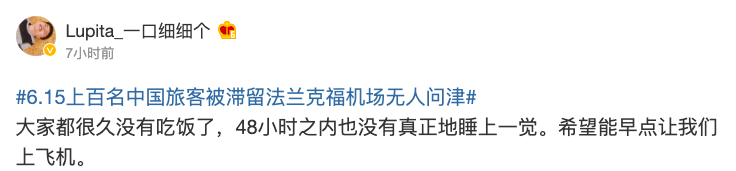 原计划于6月15日起飞,从德国法兰克福飞往上海的汉莎航空LH728航班,在飞机滑行时机长通知引擎故障,乘客乘大巴回到航站楼后,通知航班取消,飞机上近300名乘客滞留机场。