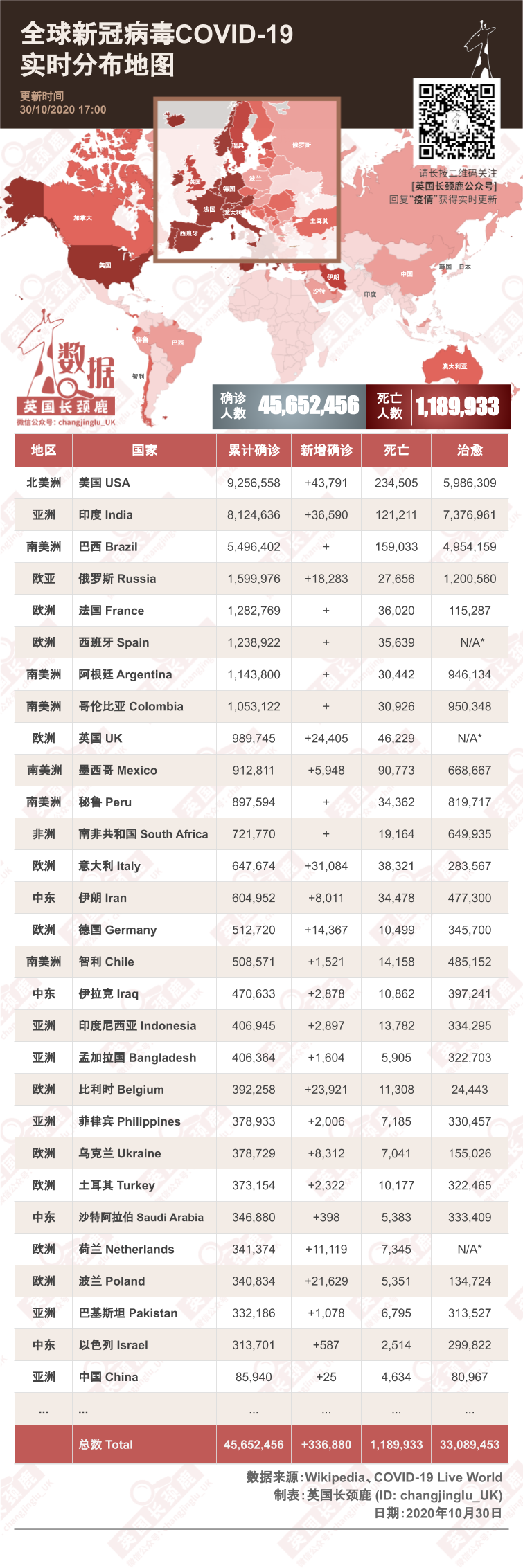 世界的累计确诊人数截止10月30日17:00超过4,565万例(+620k),死亡超过118.9万例(+7k)。