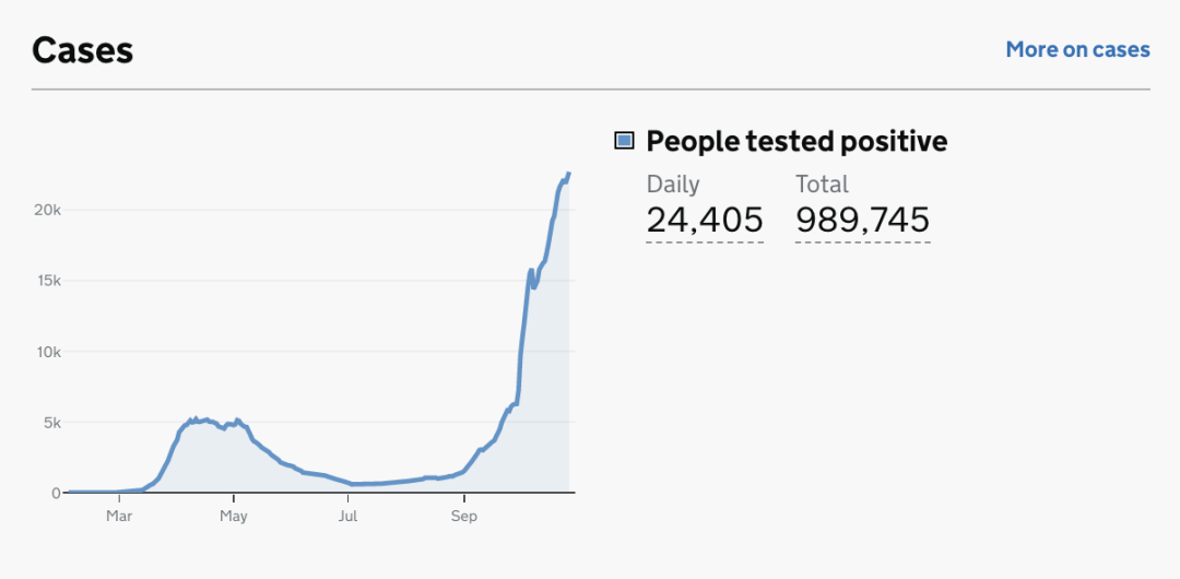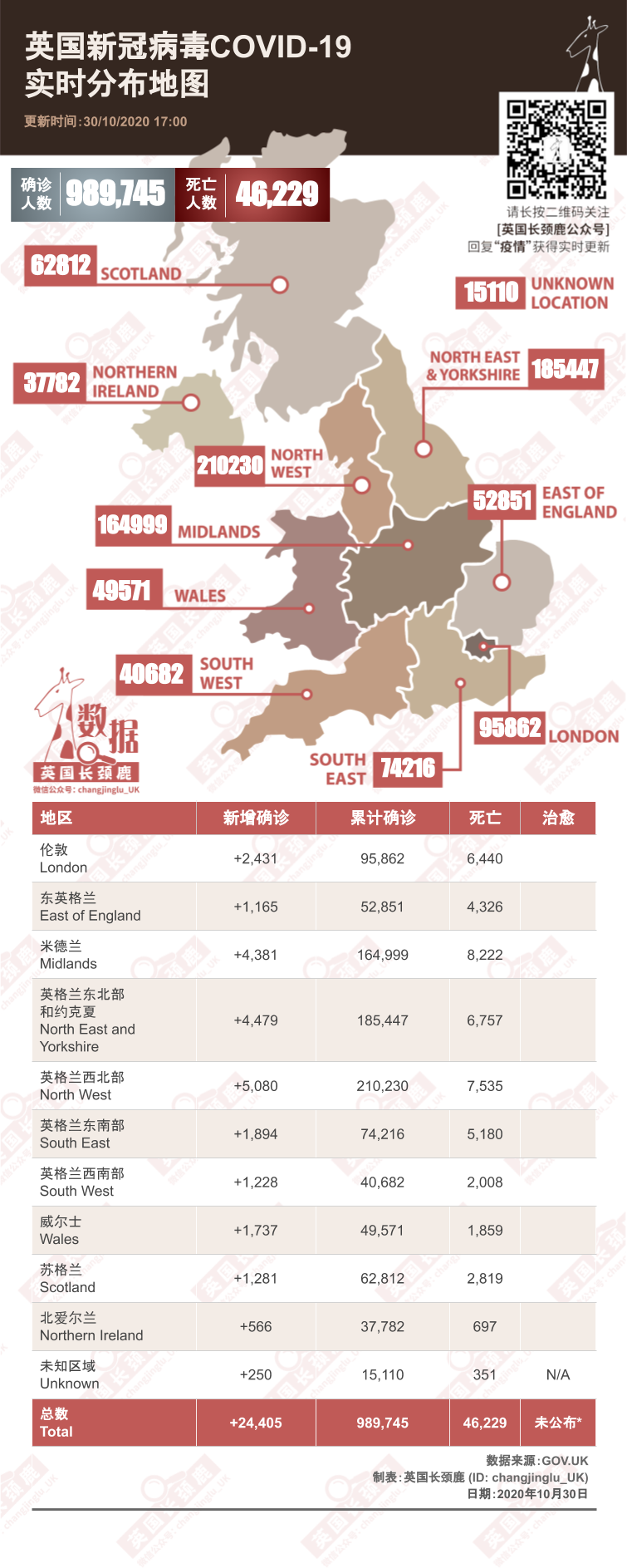 截止至2020年10月30日(周五)英国时间09:00,累计检测结果量30,941,069次(+347,626);累计确诊989,745例(+24,405);累计病亡46,229例(+274)。