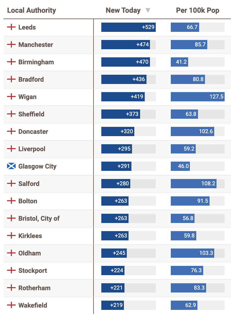 在新增前20当中,还有苏格兰的格拉斯哥(+291)疫情也较为严重。