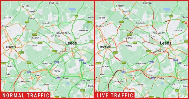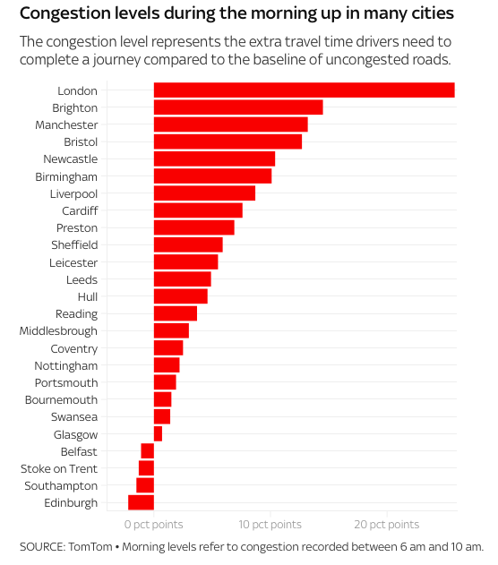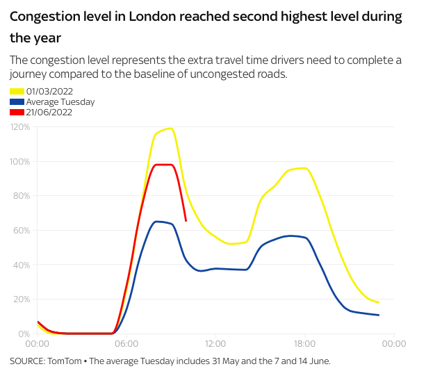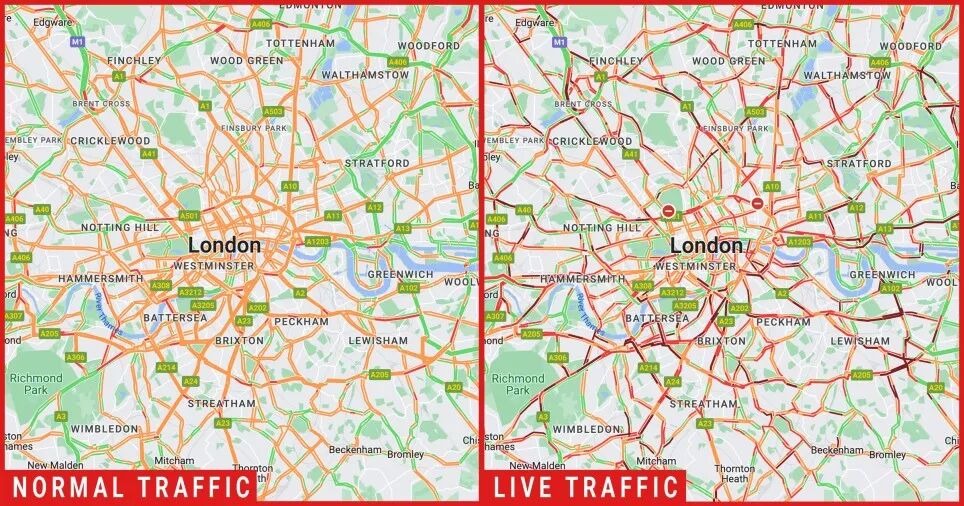 在早上6-10点之间,伦敦乘坐汽车或公交车的人平均需要多花费72%的时间,而在过去三周的周二,平均需要多45%的时间。