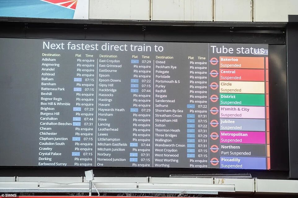 全英来看,只有五分之一的火车保持有限运行服务,超一半的线路完全关闭,几乎所有的铁路网络都将在下午18时30分关闭。