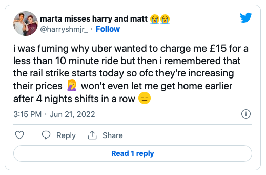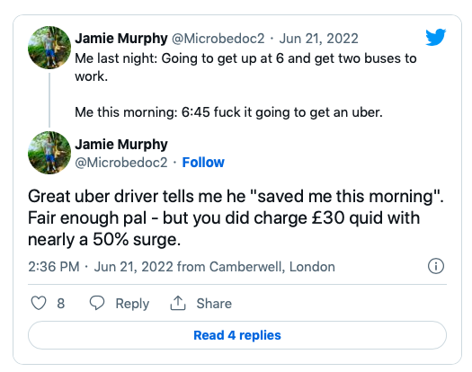 乘客表示,“不到10分钟的车程费用为£15“;”附加费收取了近50%“。据悉,上午8时45分左右,从帕丁顿到国王十字路口的三英里旅程估计需要£27。