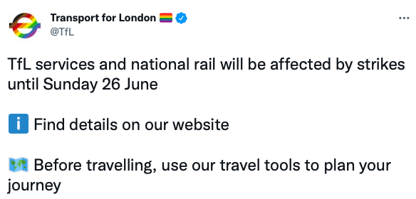 尽管目前来看,伦敦地铁网络正在逐步恢复,但由于全国铁路罢工将于6月23日(周四)和6月25日(周六)举行,伦敦交通局官网仍发出了持续罢工影响服务警告——
