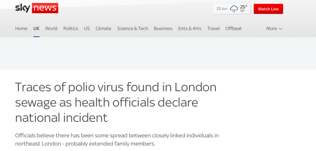 b。英国宣布发生全国性事件:伦敦污水中发现脊髓灰质炎病毒