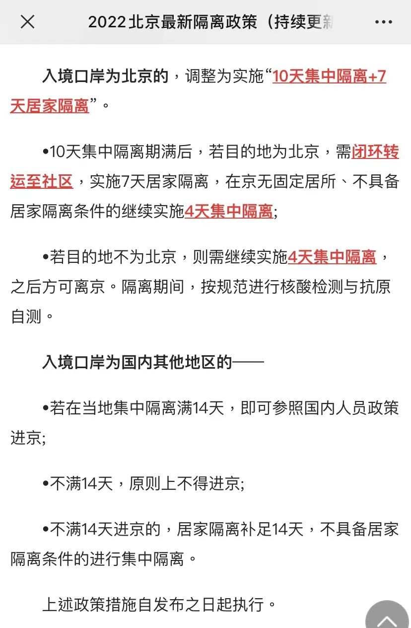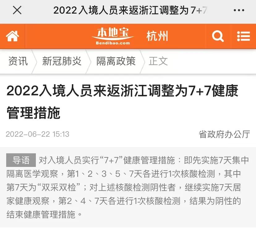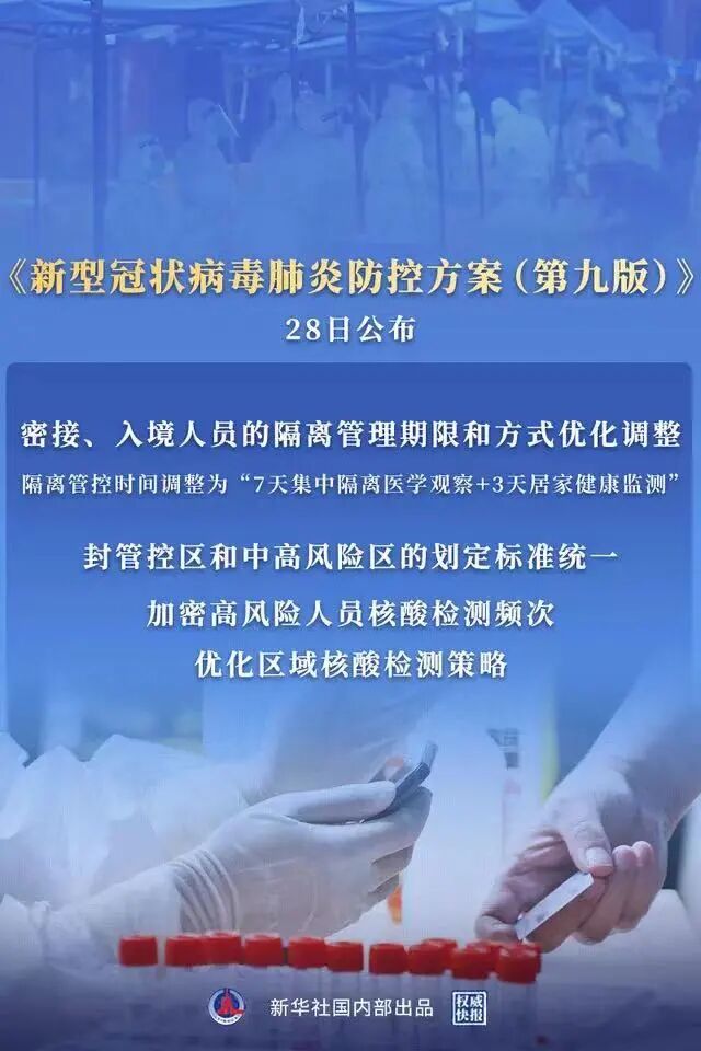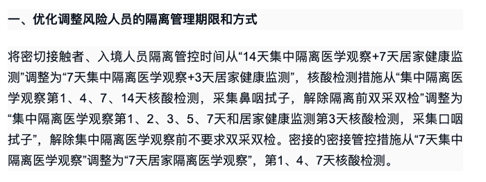 入境人员隔离 管控时间从“14天集中隔离+7天居家健康监测”调整为 “7天集中隔离+3天居家健康监测” 。
