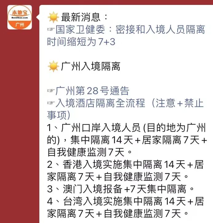 广州本地宝的隔离信息中提到“隔离时间缩短为7+3”,但仍未更新入境隔离的要求。