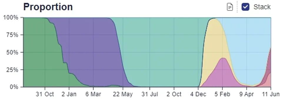 英国目前的主导传播毒株BA.2型亚株在3月份感染率创下历史新高时,几乎占所有病例的90%以上,现在仅占病例的41.7%。