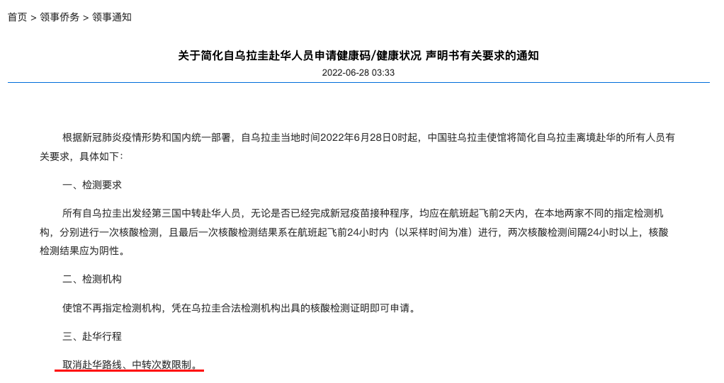 据 中国驻伊拉克大使馆 和 中国驻乌拉圭大使馆 6月28日更新的最新要求,两国: