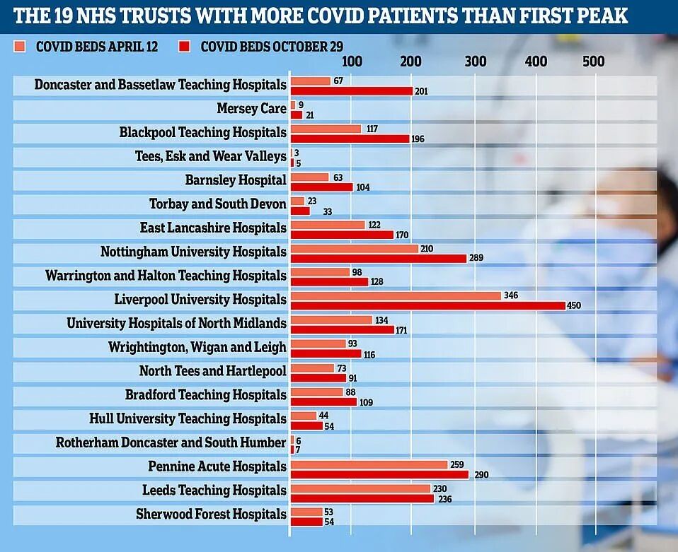目前利物浦、诺丁汉、曼彻斯特、利兹等地医院接受的新冠病人数量已经超过了第一波疫情|信息来源Dailymail