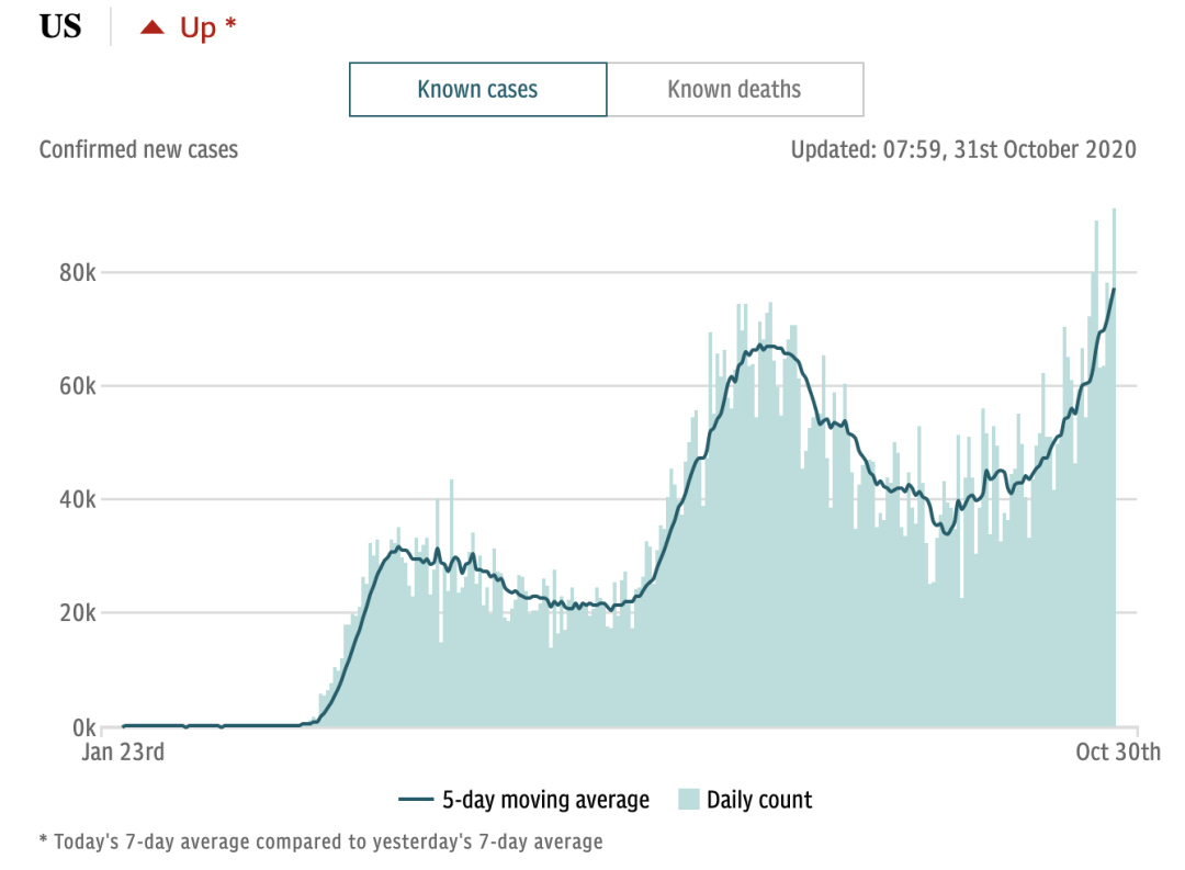 世界的累计确诊人数截止10月31日17:00超过4,619万例(+540k),死亡超过119.8万例(+9k)。