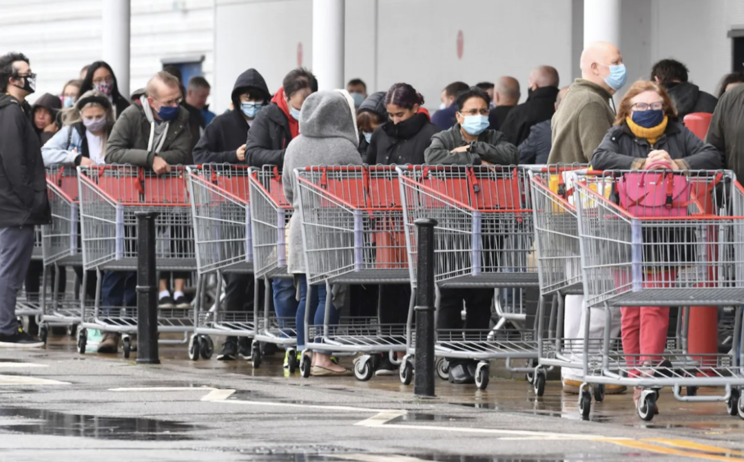 超市方面,恐慌性囤货又来了——今日一大早,Costco曼彻斯特门口的顾客们就在大雨中等待。英国各地超市的货架上卫生卷纸直接被清空,顾客在商店外面大排长龙。