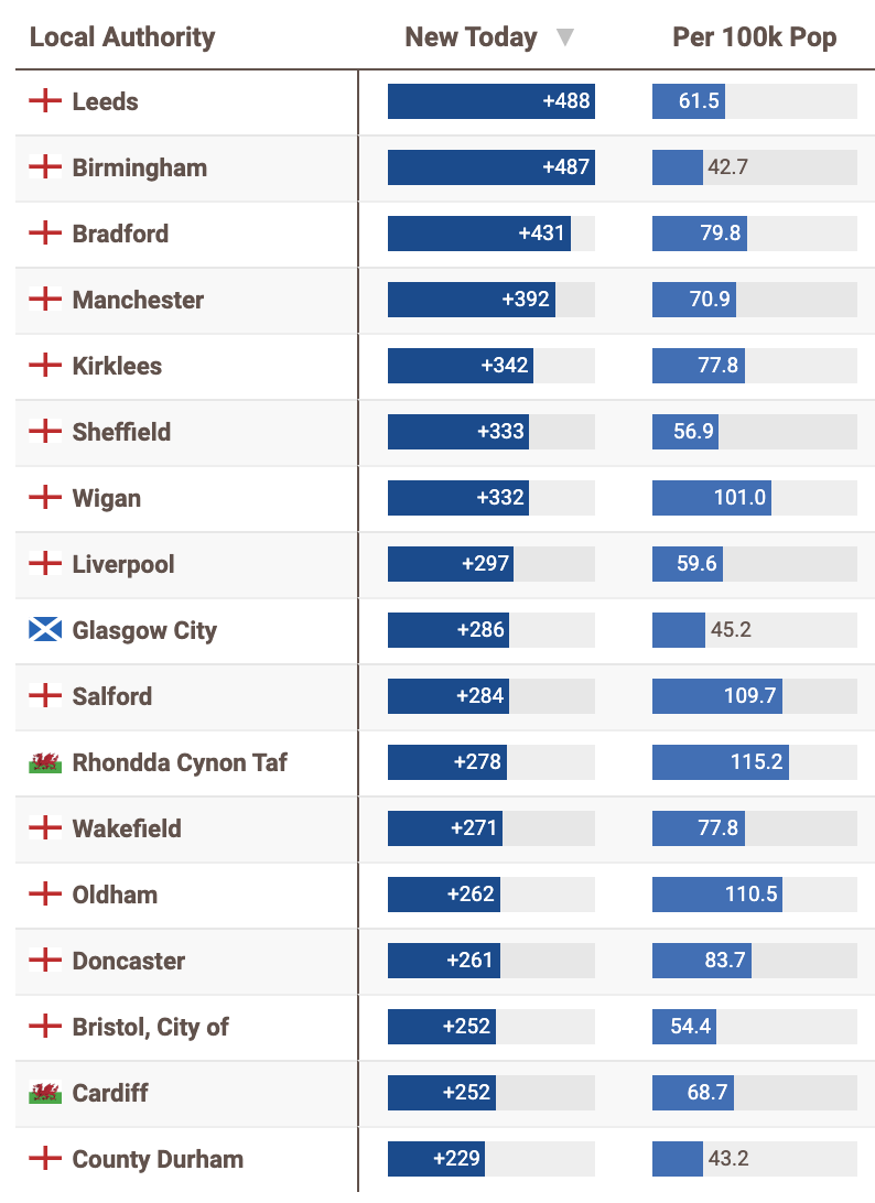 在新增前20当中,还有苏格兰的格拉斯哥(+286)以及威尔士的卡迪夫(+252)疫情也较为严重。