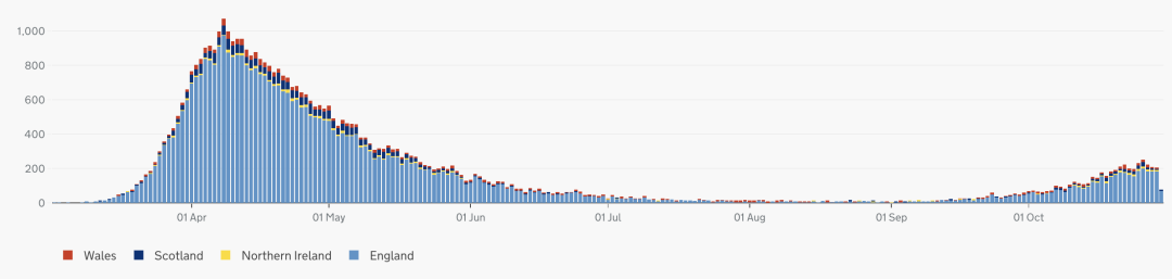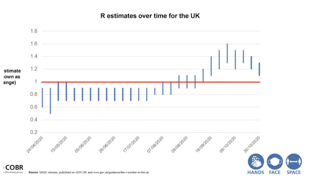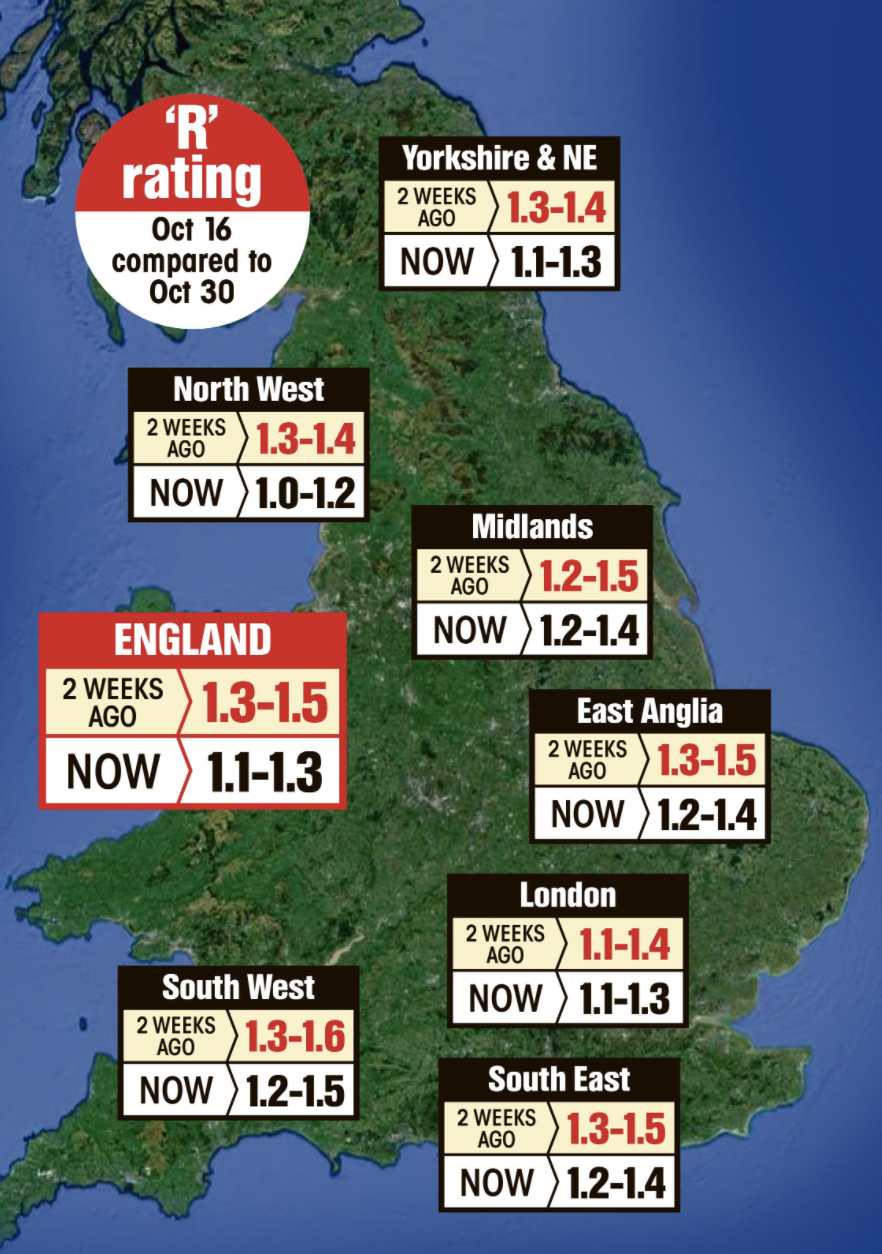 10月30日(周五)官方最新公布的新冠感染率指标显示:英国的平均R值目前仍旧在1.1~1.3之间,表明新增确诊和传播速度仍在增加。