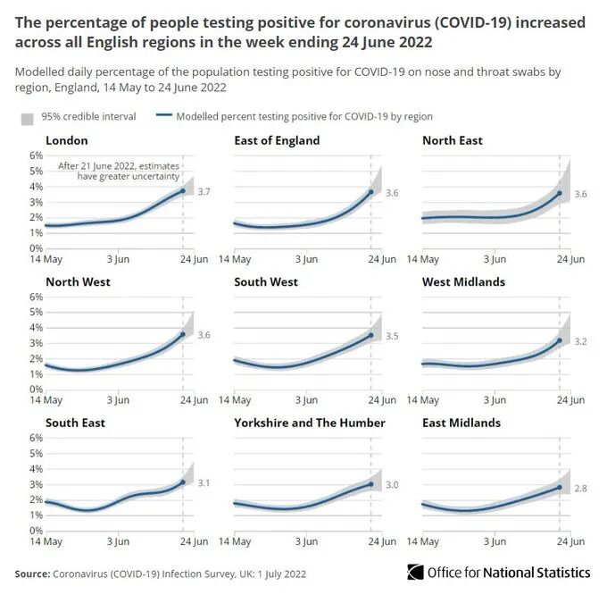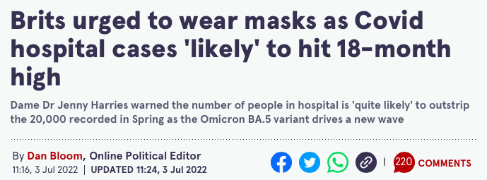 英国卫生安全局首席执行官Dame Jenny Harries博士于7月3日(周日)发出警告,“此轮新冠感染浪潮尚未达到顶峰,新冠住院人数可能达到18个月以来的最高水平“,并敦促人们在拥挤和封闭的空间再次戴上口罩。
