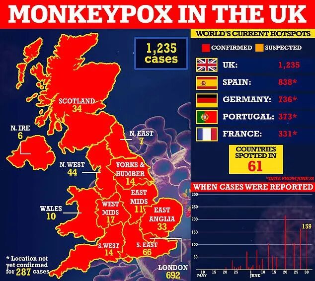 截止7月1日,英国累计确诊猴痘感染病例1,235例