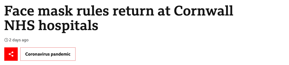 从7月4日(周一)起,康沃尔郡Cornwall所有医院、医疗单位和治疗中心的病人、工作人员和访客都需佩戴口罩。