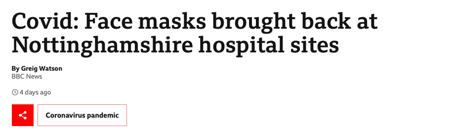 另外,诺丁汉郡的部分医院也重新恢复了口罩要求。King's Mill、Newark和Mansfield社区医院的新冠住院患者人数增加,这三所医院要求恢复“口罩令”,并继续保持社交距离。