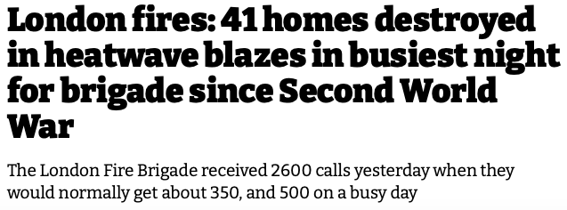 伦敦消防局统计显示,当日接到了超过2,600通报警电话,至少有41所房屋在热浪中被烧毁。而通常情况下每天的电话数量约为350通,在繁忙时也仅为约500通。