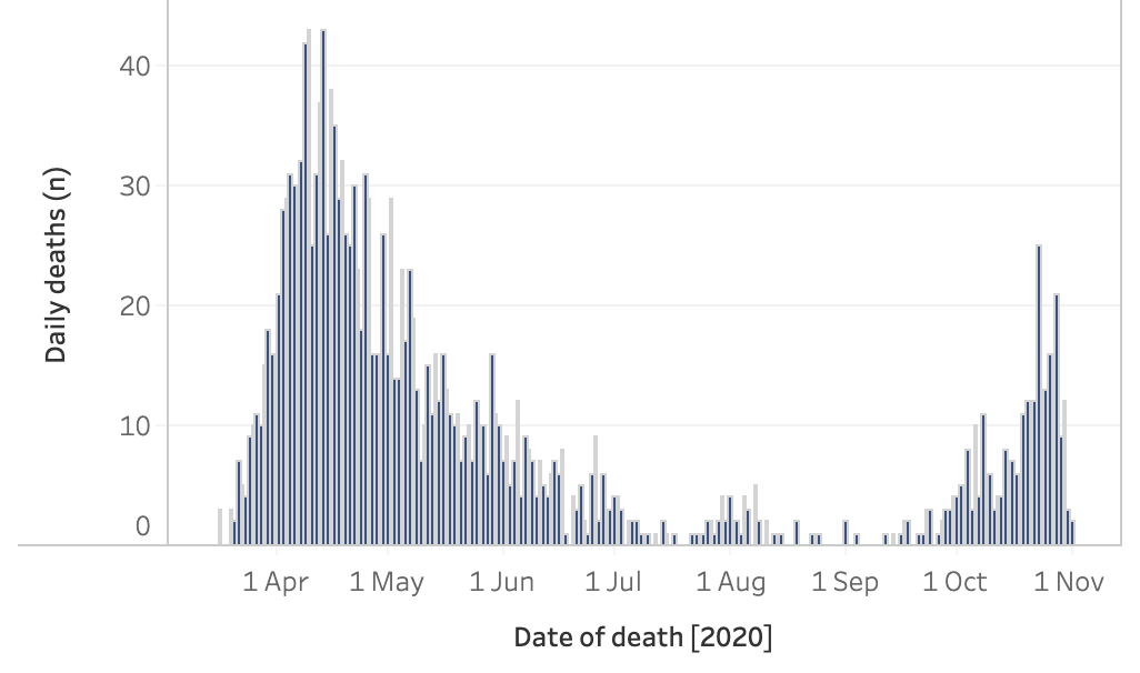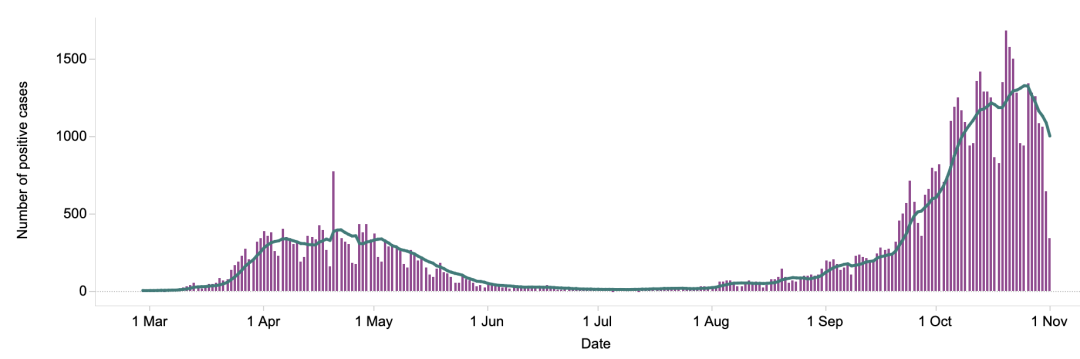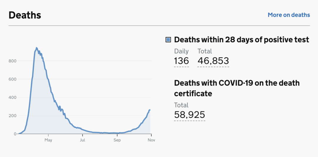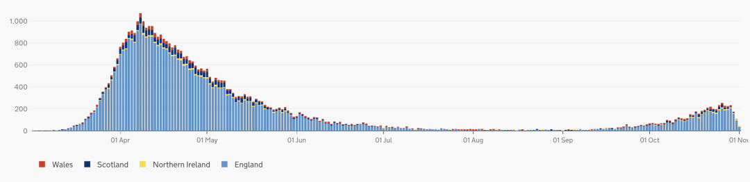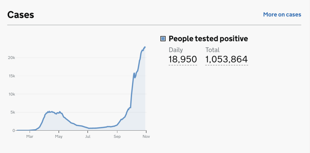 截止至2020年11月2日(周一)英国时间09:00,累计检测结果量31,817,003次(+270,473);累计确诊1,053,864例(+18,950);累计病亡46,853例(+136)。