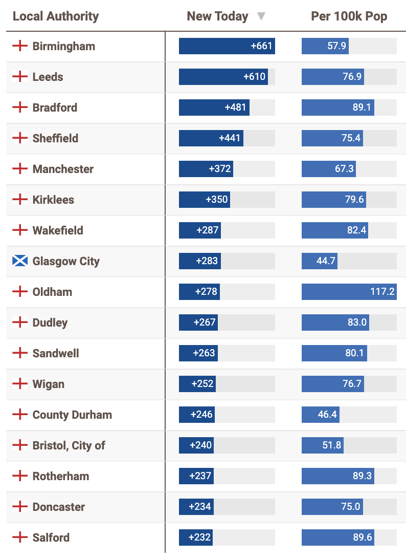 此外,利兹(+610)、谢菲尔德(+441)、曼彻斯特(+372)、格拉斯哥(+283)、杜伦郡(+246)、布里斯托(+240)等日增均超过200例。