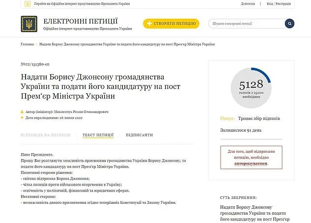 7月26日,一份旨在给予即将离任的英国首相鲍里斯乌克兰公民身份并使其成为该国总理的请愿书,在乌克兰官方请愿网站上挂出数小时后获得了超过5,000个签名。如果在未来三个月内收到25,000个签名,泽连斯基先生将有义务对此做出正式回应。