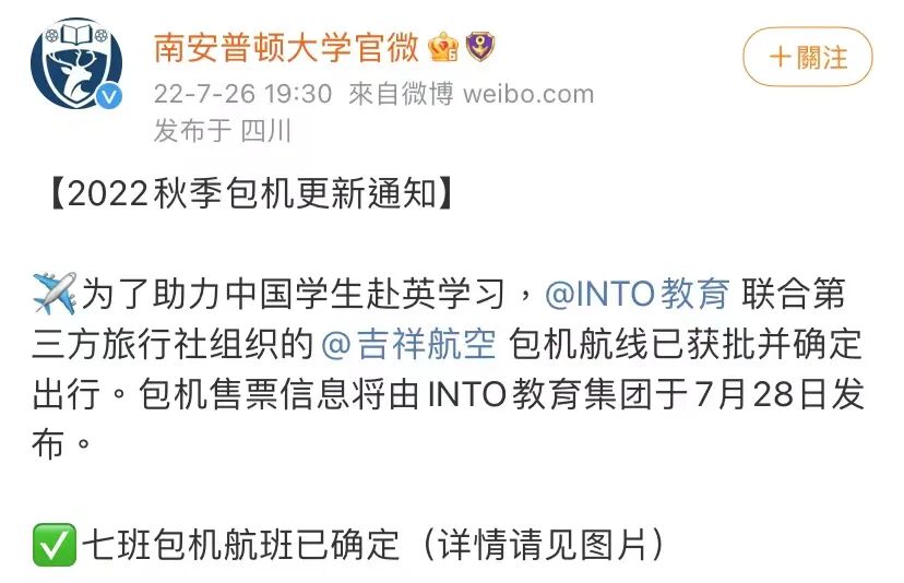 7月28日(周四),INTO教育集团官方宣布,正式开启9月「上海-英国」直航包机售票!