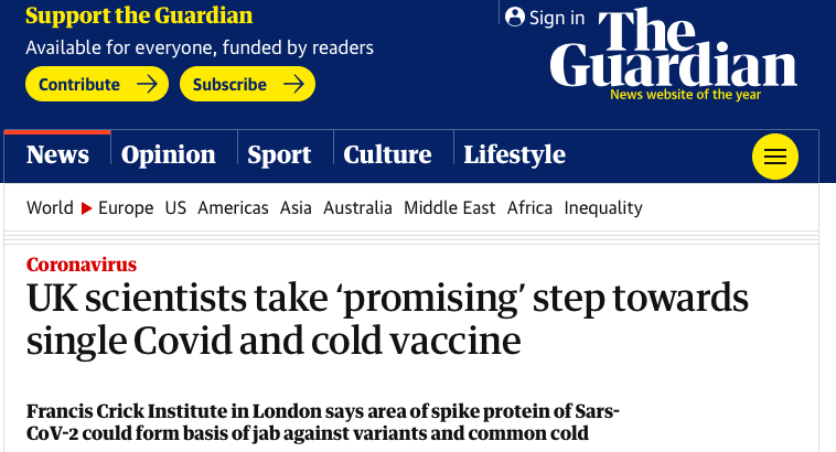 伦敦Francis Crick研究所的研究人员发现,导致新冠病毒Sars-CoV-2的穗状蛋白中的特定区域——S2亚单位(S2 subunit)可用于研发针对不同变种的通用新冠疫苗,同时可以对普通感冒提供保护。