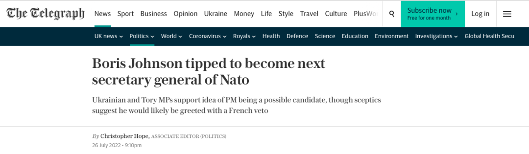 据包括《每日电讯报》(TheTelegraph)在内的多家媒体报道,鲍里斯很可能在现任北约秘书长Jens Stoltenberg于2023年9月离任后接任这一职位。