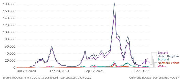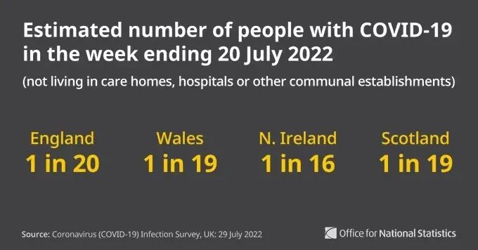 根据国家统计局(ONS)的最新数据,在截至7月14日的一周内,全英新冠感染人数约为380万,增长约7%,超过一周前330万的数据。感染浪潮仍由目前的主导传播毒株Omicron变种的BA.4和BA.5型亚株驱动。