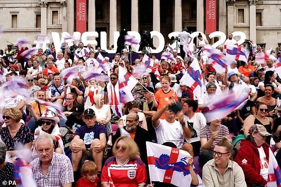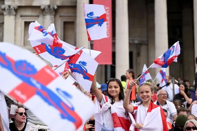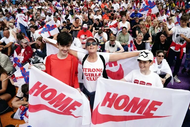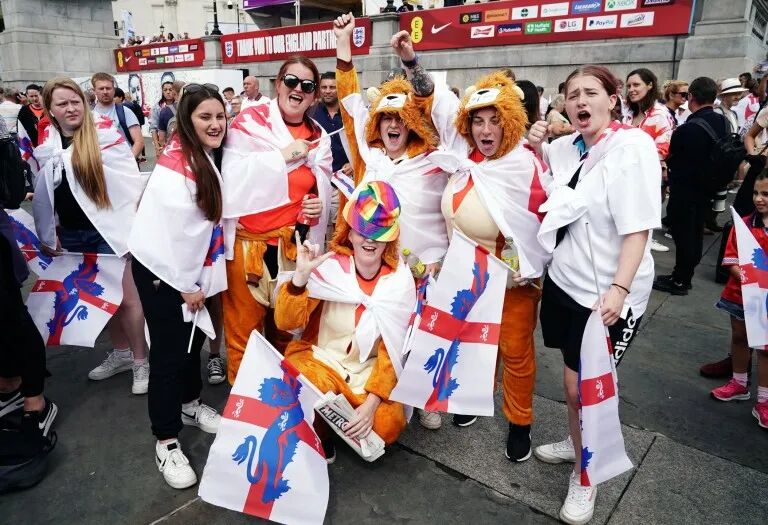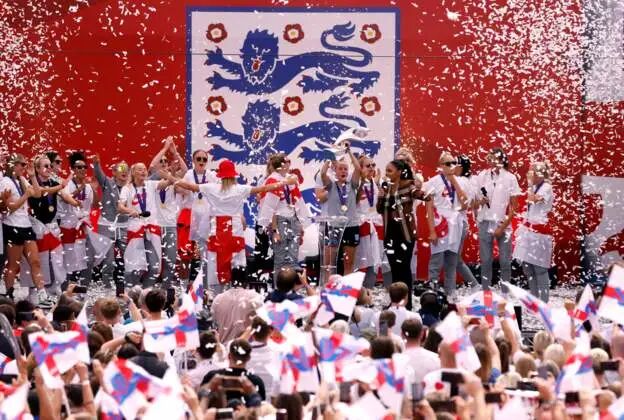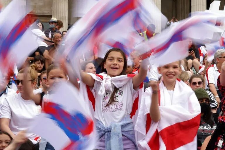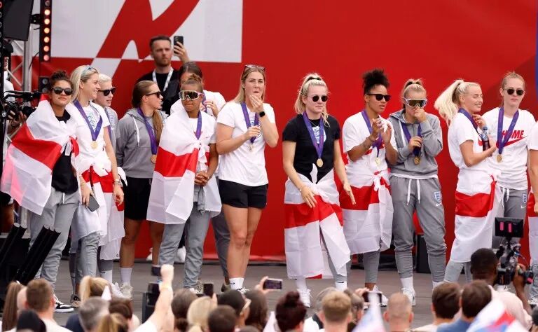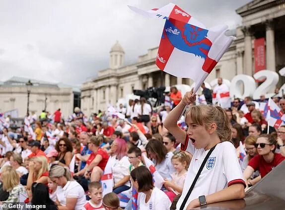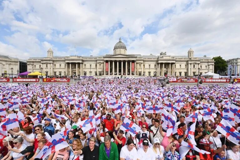 球队戴着获胜金牌,在伦敦特拉法加广场举行球迷互动活动。预计现场有超过7,000名球迷,披着英格兰国旗,穿着周边衬衫,一同庆祝胜利。