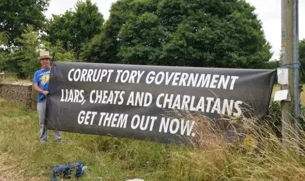 然而,现场也出现了一位“不受欢迎的人”——反英国脱欧抗议者Steve Bray,在婚礼现场附近挂出“反对保守党”的巨幅标语。