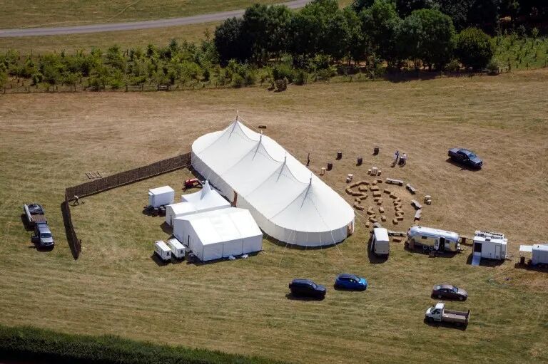 婚礼活动是在戴尔斯福特庄园前广阔的景观场地举行的,现场搭起了巨大的白色帐篷,挂起彩旗,准备好精致的餐具和酒水食物。