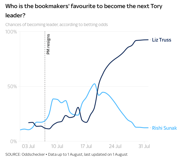 据天空新闻Sky News截止8月1日的最新数据显示,外交大臣Liz Truss的民调支持率仍以明显优势超过前财政大臣Rishi Sunak。