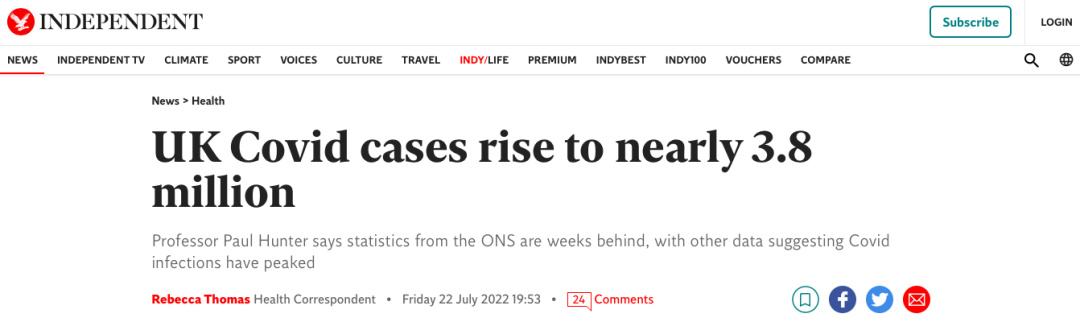 领导新冠分析应用程序ZOE项目的Tim Spector教授称,“新冠病毒仍在迅速传播”。ZOE健康研究数据显示,本周单日纪录新增感染者超过35万,创下疫情以来新纪录。