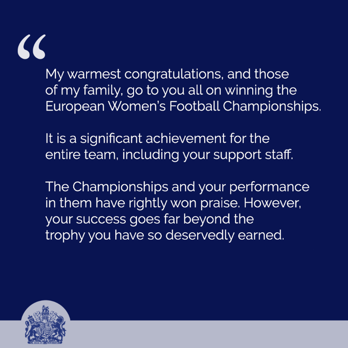 英国女王在社交媒体上为姑娘们发来祝贺:“你们的成功远远超出了当之无愧的奖杯。你们都树立了榜样,将成为今天和未来几代女性的激励”。