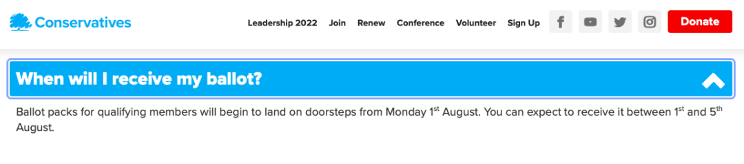 按照保守党网站的信息,具备投票资格的保守党成员*将于8月1日至5日收到邮寄的选票包,并在英国当地时间9月2日17:00前完成投票。