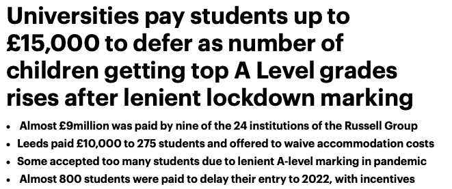 据《每日邮报》(Daily Mail)报道,英国部分顶尖大学向学生提供了至多高达£15,000的现金,以支持其推迟入学。