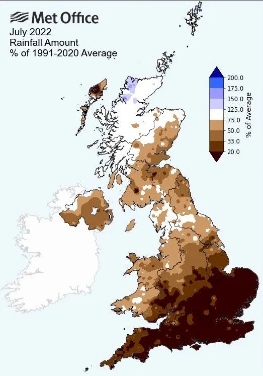 英格兰东南部和中南部7月平均降雨量只有5.0毫米,东安格利亚East Anglia有5.4毫米。对于这两个地区来说,创下自1836年气象局开始记录以来,7月份的最低降雨量。