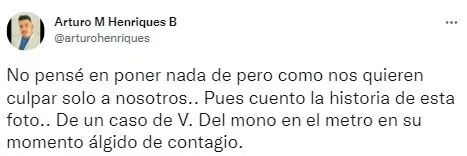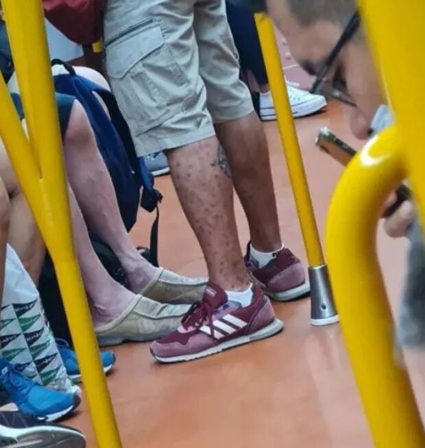 该照片由西班牙一名外科医生发布于社交媒体,“7月15日,早上6时20分。这位先生在Legazpi车站上了车。全身出现皮疹,这是明显的猴痘症状。我谨慎地走到这位先生面前,问他是否感染猴痘,为什么在地铁上。他的回答是:是的,我有这个病,但医生没有告诉我必须留在家里。只告诉我使用口罩“。