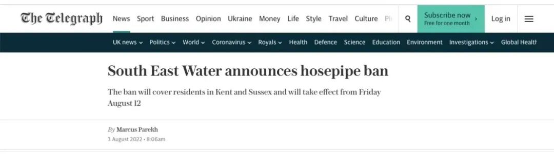 东南水务公司South East Water宣布将采取紧急措施以降低干旱风险,从8月12日起,对肯特郡和苏塞克斯郡的约300万人口实施“软皮管禁令”。